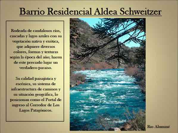 En pleno corredor de los Lagos Patagónicos , en la provincia de Neuquén, sobre el Río Aluminé, se ha fundado y preaprobado por la autoridad competente el Barrio Residencial Privado Aldea Schweitzer.
