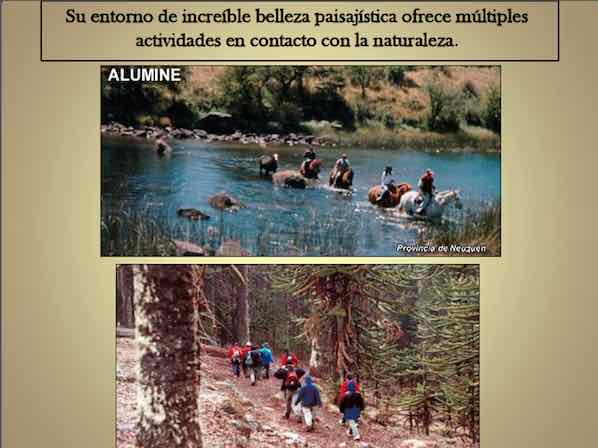 Ubicado en la Ciudad de Aluminé, Provincia de Neuquén ofrece una oportunidad única a quienes deseen constituir un negocio con un amplio futuro por delante. Allí se está desarrollando un polo turístico de amplias posibilidades con proyecto de pista de ski, pesca embarcados en el Río Aluminé, rodeado por el Portal Norte del Parque Nacional Lanín y con más de diez lagos cordilleranos en sus cercanías.